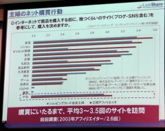 永久不滅リサーチと共同で、カード会員登録している非アフェリエイタ300名の主婦と、リンクシェアのアフェリエイターの主婦(300名)を対象にしたアンケート結果を見てみると、ばらつきがあるカテゴリも見られるが、購買にいたるまで、平均3〜3.5回のサイトを訪問し、じっくり調べてから購入しようとしていることが読取れると分析していました。