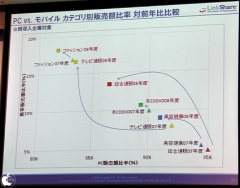 PCとモバイルとの販売額比率で見ると、ファッション系、テレビ通販系、総合通販系の順で伸びていると説明していました。
