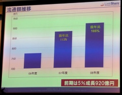 恒例のリンクシェアの実績とデータの紹介が行なわれ、208年度前期は前年度比105%で920億円を達成し、前年の成長率と比較すると鈍化しているが下回っているわけではないと説明していました。