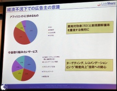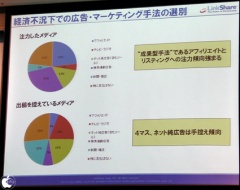 次に広告出稿側のアンケート結果として、4マス、ネット純広告は手控え傾向にあるのに対し、成果型手法であるアフェリエイト、検索連動広告に注力した企業が多かったことが分かったと説明していました。