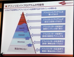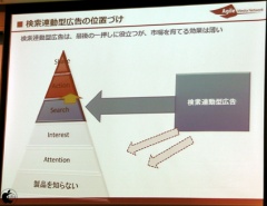 アフィリエイトで勘違いされるのは、「アフィリエイト広告」と呼ばれるので、認知を拡げる目的で使用している人が多いが、AISASピラミッドに当てはめて考えてみると、検索連動型広告は、検索にマッチするが、検索させようといった動きを加えるのは難しいと述べていました。