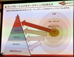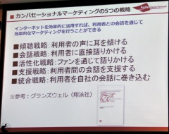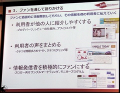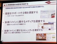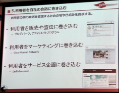 利用者をマーケティングに巻き込む「Cisco Human Network」や、利用者をサービス企画に巻き込む「Dell IdeaStorm」などを紹介し、利用者自体を販売や宣伝に巻き込む場を提供するのも良いと説明していました。