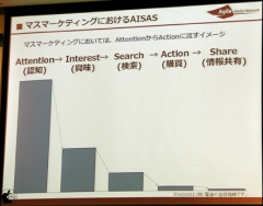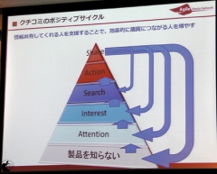 電通のマスマーケティング手法に「AISAS」というのがあるが、これを見ると、認知数だけ上げることに注力すれば、その割合比率的に購買数が獲得出来るという方法論だが、これはマスマーケティング手法で、このAISASをピラミッド型にしてクチコミマーケティングを考えると、ピラミッドの間に人がいると考えると良いと思うと述べていました。