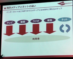 この双方向性が重要で、4マスを使った一方通行なマーケティング手法をインターネットに持込んでも、あまり意味はないと考えた方が良いと述べてました。