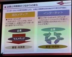 インターネット上のマーケティングにおいては、利用者の声に耳を傾けるのが最大の戦略だと思っていると述べ、従来のマスマーケティングでは、相手の話しを聞かないで、いきなり話しかけた後にアンケートを行なったりして、利用者の声を拾っていたが、実際の本音を聞くことは難しかったと説明していました。