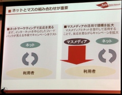 ネットマーケティングを行なう場合、ユーザーの声を聞き、反応を見てからマスマーケティングの露出を考える方が好ましく、売れた成果だけを見て判断するだけではなく、マスメディアを使った露出の後に、インターネットを通じて耳を傾け、効果を判断するのが良いと説明していました。