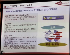 報酬を渡して記事を書いてもらうペイパーポストは「クチコミ」ではなく記事広告であると述べ、リンクシェアが行っている「レビュー・アフィリエイト」は体験をベースにしているので問題はないとは思うが、悪質なペイパーポストになると、SEO効果をうたって、体験も何も無しに報酬を払ってプレスリリースなどを書いてもらう事を依頼し、依頼されたブロガーは、広告記事とは書きたくないので、プレスリリースを編集するなどして、ほぼコピペでそれっぽく書いてしまっている場合があり、そうすると同じような文章で、欲しいですといった内容の記事がたくさん生まれてきて、やらせという印象が残ってしまうことは問題だと思うと話していました。