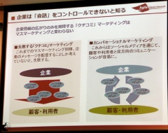 従来の手法を「マスマーケティング」と呼び、ソーシャルメディアを通じて、顧客や利用者と双方向のコミュニケーションをとる手法を「カンバセーションマーケティング」と呼ぶと説明していました。