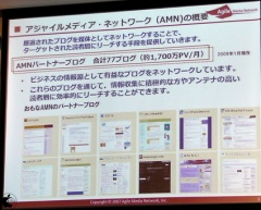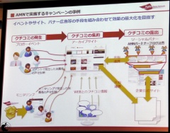 AMNのキャンペーン実施事例として、ブロガーイベントを通じて、クチコミを発生させ、トラックバックハブといったアーカイブサイトを用意し、クチコミの集約を行い、ソーシャルバナーによって、クチコミの露出を行っていると説明していました。