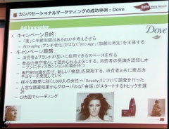 カンバセーショナルマーケティングの成功事例として「dove evolution」や「Dove Pro-age Campaign」などを紹介し、これらは、誌面広告、マスメディア広告で別々に考えるのではなく、全てトータルで考えるべきで、利用者がいるところにターゲットをしっかり当てることが重要だと説明していました。