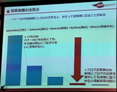 効果指標の注意点として、現在は、ページビューとコンバージョンの2つの効果指標が重要視されがちだが、ぜひ中間指標を作成し、層にあった効果指標を考えて欲しいと述べていました。
