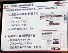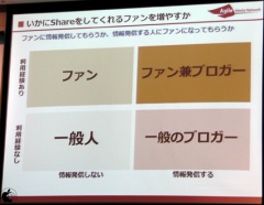 企業が重用視するのは、ファンだと考えると述べ、よくある手法として、一般のブロガーの人に製品を提供するなどして、まずファンになってもらう事を意識しがちだが、実は、そもそもファンである人に、なんらかの形で、情報を発信してもらえるように促し、ファン兼ブロガーになって貰えるよう努力した方が良いと考えていると説明していました。