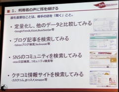 それに対して、インターネットマーケティングでは、ミクシィの日記検索なり、クチコミ情報サイトを検索してみて、本音に耳を傾けるのが重要なポイントだと説明していました。