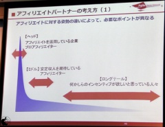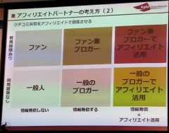 アフィリエイトパートナーに対しての考え方としては、アフィリエイトプロは非常に少ないと考え、注力するのは「ファン兼ブロガーでアフィリエイトを活用されてる方」に対して、積極手にアフィリエイトプログラムの存在を知ってもらう事が大事ではないかと考えていると述べてました。