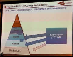 バナー広告商材は、インターネット、アテンションの部分で、市場を大きくしたいという思惑がある場合に有効で、テレビCMは、一番下の製品を知らない人に対して行い、画面全体を製品で占めるという手法は、バナー広告では難しいので、まったく知らない人にアプローチしたければ、マスメディアを使う手段も有効だと思うと説明していました。