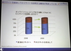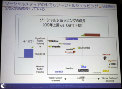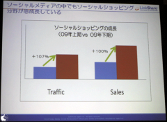 ソーシャルショッピングの成長を2009年度上期と下期とで比較してみると、トラフィックは107%上昇、売り上げは100%上昇していて、情報の共有機能を強化したサービスが伸びてきていることが分かると説明していました。