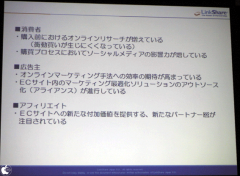 まとめとして、消費者は、購入前におけるオンラインリサーチが増え、衝動買いが生じにくくなっており、購入プロセスにおいて、ソーシャルメディアの影響力が増している傾向にあり、広告主は、オンラインマーケティング手法への効率への期待度が高まり、アフィリエイトは、ECサイトへの新たな付加価値を提供するパートナー層が注目されていると説明していました。