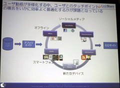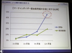 マーチャンダイザー経由の販売額の全体に対する比率を見てみると、商品検索による購買が強まる傾向にあり、家電など仕様比較が求められる場合、こうしたデーターベースを利用したサービスの成果が高いことが見てとれると説明していました。