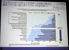 次に「米国広告主のマーケティングトレンド」として、オンラインマーケティング手法への効率化への期待が高まっていて、ソーシャルメディア関連のプロモーションや、動画への期待度が高くなっていることが分かると説明していました。