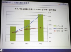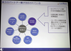 ECサイトとのパートナーとして、クーポン系、還元系、検索系、ショッピングサーチ、サブネットワーク、専門ポータルといった以外に、ECサイトに対して、新たな付加価値を提供したり、ユーザーとの関係を最適化することを支援する第3のパートナー層が出現し、そうしたパートナーは、比較的高い料率の成果報酬を得ていると説明していました。