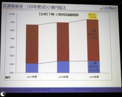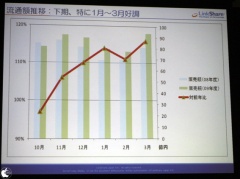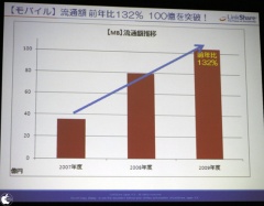 最初に「リンクシェア・ネットワーク・トレンド」として、流通総額推移をみると、2009度105%となり、上期前年比109%、下期前年比101%と大きく違いがあると説明していました。