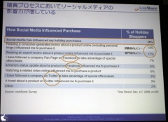 ホリデーショピングにおけるソーシャルメディアの影響度は28%で、そのうち個人レビューが13%、プロレビューが11%、それに加えて、Facebook、Twitterの影響も上がってきていると説明していました。ただ、この調査結果を見る限り、アメリカにおける口コミの影響割合は3割り以下ということで、日本のように他人の意見に感化されやすい国ではないことも分かります。