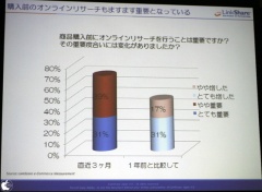 商品購入前にオンラインリサーチを行う事は重要ですか?また、その重要度合いには変化がありましたか?という質問に対して、オンラインリサーチを行うユーザーが顕著に伸びていて、重要度も高くなっていることが分かると説明していました。