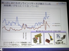 クリスマス商戦期におけるクリック前年比と、販売額の前年比を比べてみると、11月第4木曜日の「ブラック・フライデー」と、翌日の「サイバーマンデー」の前に、念入りにリサーチしていることが分かり、クリスマス出荷締切直前でもリサーチするユーザー数は増える傾向にあり、購入前におけるオンラインリサーチが増えていることが分かったと説明していました。