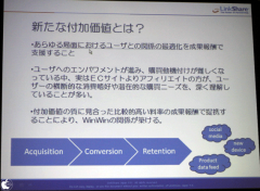 新たな付加価値とは?あらゆる局面におけるユーザとの関係の最適化を成果報酬で支援すること。ユーザへのエンパワメントが進み、購買動機付けが難しくなっている中、実はECサイトよりアフィリエイトの方が、ユーザーの横断的なニーズを深く理解していることが多い。付加価値の質に見合った比較的高い料率の成果報酬を提供することにより、WinWinの関係が築けると説明していました。