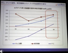 ECカテゴリー別の流通総額の伸長率を比べてみると、テレビ通販は、エコポイントの駆け込みラッシュを受けて成長し続け、美容健康は第2四半期に成長が落ちたが、その後盛り返し、PCは昨年10月からプラスに転じたと説明していました。PCカテゴリーの成長には、Windows 7の影響があるようだと分析していました。