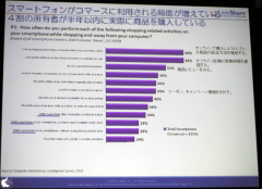 スマートフォンユーザーが、オンラインリサーチで何を調べているか?を調べてみると、オンラインで購入した商品の商品配送方法を確認するが68%、オフライン店舗の営業時間を確認するが68%、商品レビューを見るが52%、関連商品のレビューを見るが45%、オンラインストアーを見るが43%、クーポン、キャンペーン情報を探すが43%といった感じで、スマートフォンユーザーの4割りが、半年以内に実際に商品を購入していると説明していました。