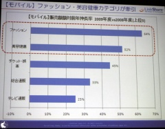 モバイルのカテゴリー別販売額伸長率を見てみると、ファッションが64%、美容健康が52%と、昨年より倍以上伸びていると説明していました。
