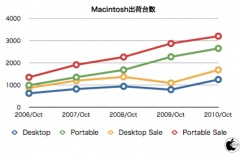 過去の同四半期と比較すると、Macintoshの場合、デスクトップは昨年同期よりも57%増加、ポータブルは昨年同期よりも16%増加、Macintosh全体の出荷台数は27%の増加となり、iMac (Mid 2010)の販売が好調だったことが確認できます。