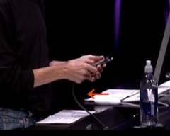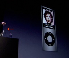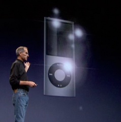 iPod nano (4th generation)のデモで、Steve Jobs CEOが手にしているiPod nano (4th generation)の画面がメインスクリーンに映し出されています。それを実現しているのが、iPod nano (4th generation)に接続されている黒いケーブルです。