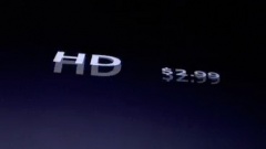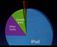 映し出されているだけでなく、Steve Jobs CEOがiPod nano (4th generation)を傾けると、メインスクリーンのiPod nano (4th generation)も追随します。これは、初代iPod touchの時に初めて使われた手法で、ステージコントロールからの手動によるものです。ただ、回数を重ねるごとにスムーズになっている気がします。なぜ手動だと言えるのかですが、iPod touch (2nd generation)のデモでムービーを傾けて表示させる時、メインスクリーンが先に傾くので注意して見てみて下さい。