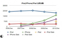 iPod/iPhoneの場合、iPodは昨年同期よりも8%減少、iPhoneは昨年同期よりも85%増加していることが見てとれます。