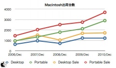 過去の同四半期と比較すると、Macintoshの場合、デスクトップは昨年同期よりも1%低下、ポータブルは昨年同期よりも36%増加、Macintosh全体の出荷台数は22%の増加となり、MacBook Air (Late 2010)の販売が好調だったことが確認できます。