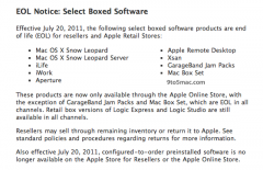 店頭販売が終了となるのは「Mac OS X Snow Leopard」「Mac OS X Server Snow Leopard」「iLife」「iWork」「Xsan」「Aperture」「Apple Remote Desktop」「GarageBand Jam Packs」「Mac Box Set」で、このうち「GarageBand Jam Packs」と「Mac Box Set」を除くパッケージ製品は、Apple Online Storeで継続販売されるそうです。