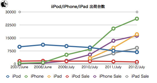 iPadは、販売台数、売上ともに急成長を続けているようですが、iPhoneは緩やかな成長になっているようです。