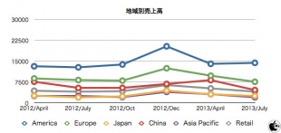 Appleが、2013年度第3四半期の決算報告を発表しています。当四半期の売上高は353億ドル、純利益は69億ドル、希薄化後の1株当り利益は7.47ドル。前年同期の業績は、売上高が350億ドル、純利益が88億ドル、希薄化後の1株当り利益が9.32ドルでした。売上総利益率は、前年同期の42.8%に対し36.9%となり、当四半期の米国市場以外の売上比率は57%だったと報告しています。