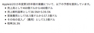 Appleは、2015年度第2四半期決算報告の中で、2015年度第3四半期の業績について、売上高として460億ドルから480億ドル、売上総利益率として38.5%から39.5%と予測していましたが、それ越える決算となっています。