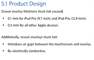 液晶保護フィルムの厚さに関する記述が追加され、iPad Pro (9.7-inch)、iPad Pro (12.9-inch)は厚さ0.1mm、それ以外のタッチ液晶デバイスでは厚さ0.3mmを超えてはならないと説明がされています。