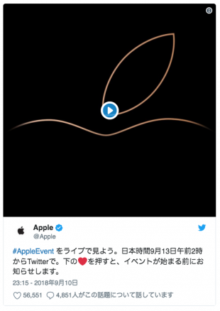 #AppleEvent をライブで見よう。日本時間9月13日午前2時からTwitterで。下の❤️を押すと、イベントが始まる前にお知らせします。 pic.twitter.com/RpWr2ac6fc