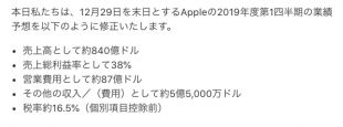 しかし、2019年1月2日にティム・クックからAppleの投資家への手紙を発表し、売上高として約840億ドル、売上総利益率として38%と予測を下方修正していました。