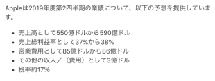 Appleは、2019年度第1四半期決算報告の中で、2019年度第2四半期の業績について、売上高として500億ドルから590億ドル、売上総利益率として37%から38%と予測していましたが、その予想範囲内に納まる結果となったようです。