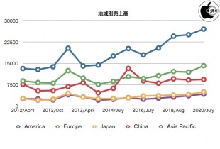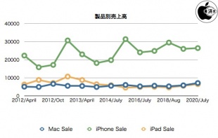 Appleが、2020年度第3四半期の決算報告を発表しています。当四半期の売上高は596億ドル、純利益は112億ドル、希薄化後の1株当り利益は2.58ドル。前年同期の業績は、売上高が538億ドル、純利益は100億ドル、希薄化後の1株当り利益は2.18ドル、当四半期の米国市場以外の売上比率は60%だったと報告しています。