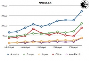 Appleが、2021年度第2四半期の決算報告を発表しています。当四半期の売上高は896億ドル、純利益は236億ドル、希薄化後の1株当り利益は1.40ドル。前年同期の業績は、売上高が583億ドル、純利益は112億ドル、希薄化後の1株当り利益は2.55ドル、当四半期の米国市場以外の売上比率は67%だったと報告しています。