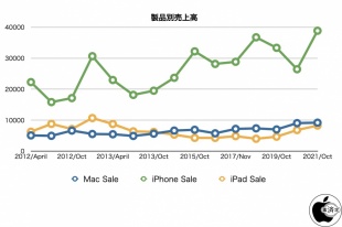 iPhoneの売上高は昨年同期と比べて46%増となり、iPadの売上高は昨年同期と比べて21%増となっています。
