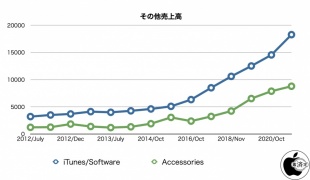 Apple Storeにおけるサードパーティ製アクセサリーの売上を加えたアクセサリーの売上に、Apple TV、iPod、Beats、Apple Watch製品が加わる「Wearables, Home and Accessories」は、昨年同期よりも11%増となっています。