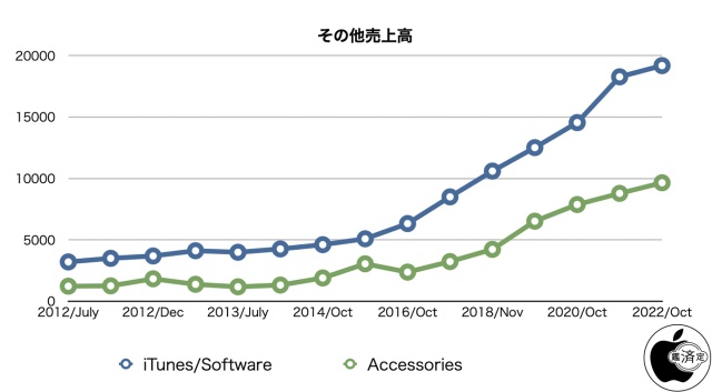 その他のiTunesとソフトウェアの売上は、AppleCareやApple Payライセンス料金などが含まれる「Services」は、昨年同期と比べて4%増となっています。